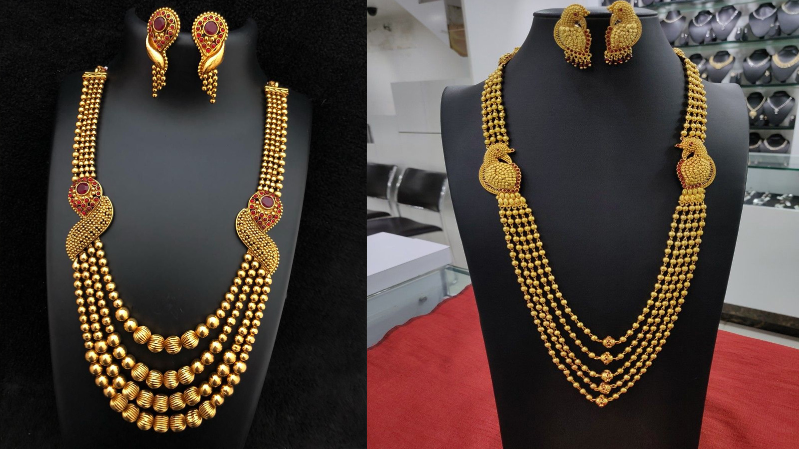 If you are looking for long Chandrahar in layers, then you can see these two designs above. While big beads have been used in one, small beads have been used in the other. You can include one of these in your jewelry box for an aesthetic look.