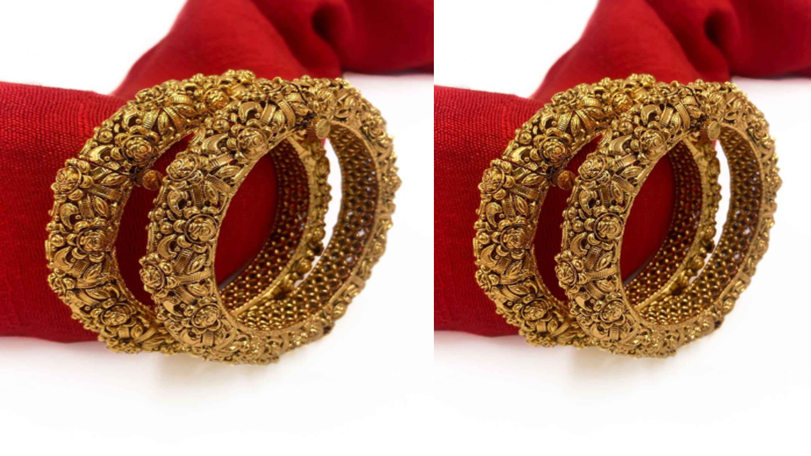 Gold plated flower cut carving bracelets will give a royal look to your hands. You can buy this antique design bangle from gehnashop for under Rs 3000. It will not look less than real gold in any sense.