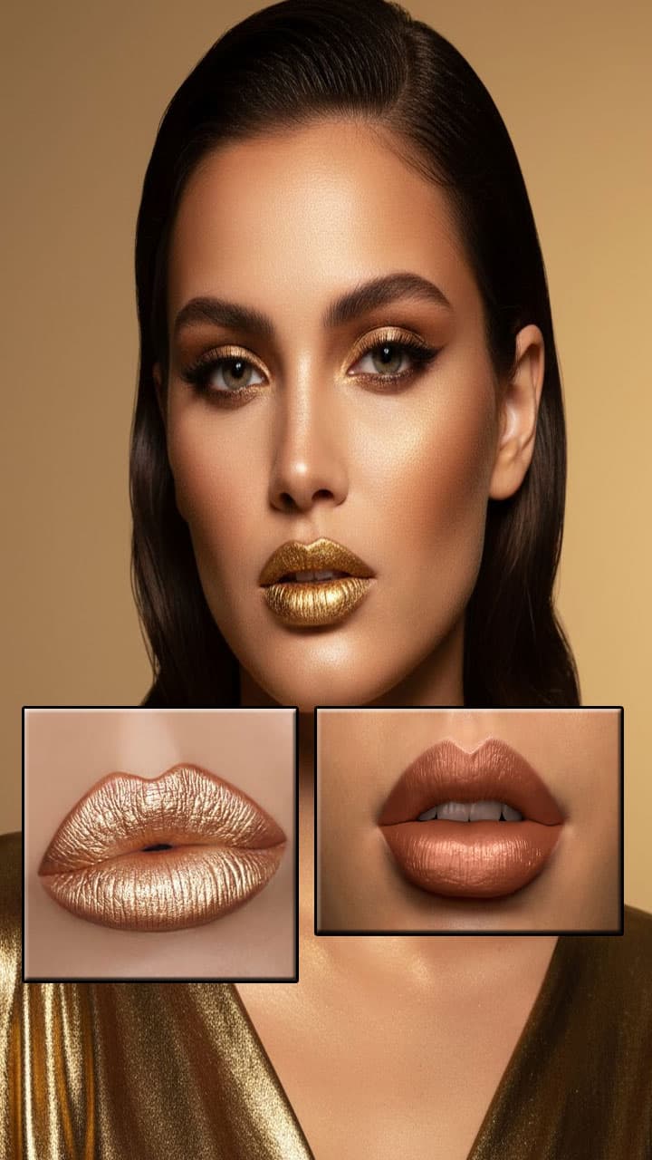 Bronze gold lipstick gives a bold and glamorous look. This shade is a great option for party wear with smokey eye makeup.