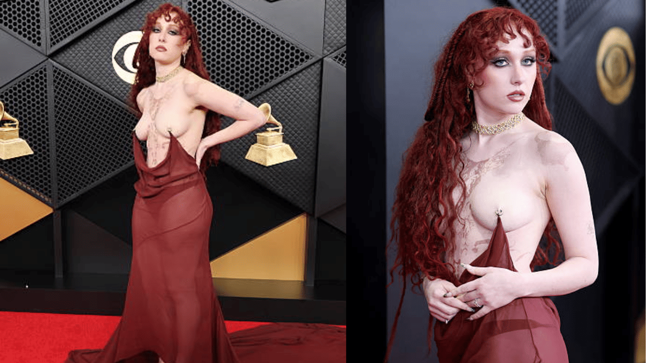 Chappell Roan shocked the 2026 Grammys red carpet in a sheer Mugler burgundy negligee dress, draped from nipple rings for a topless illusion with pasties peeking through. The medieval-inspired bare-front look, paired with a dramatic cape reveal, screamed avant-garde chaos over chic glam—weirdly theatrical and meme-worthy.
