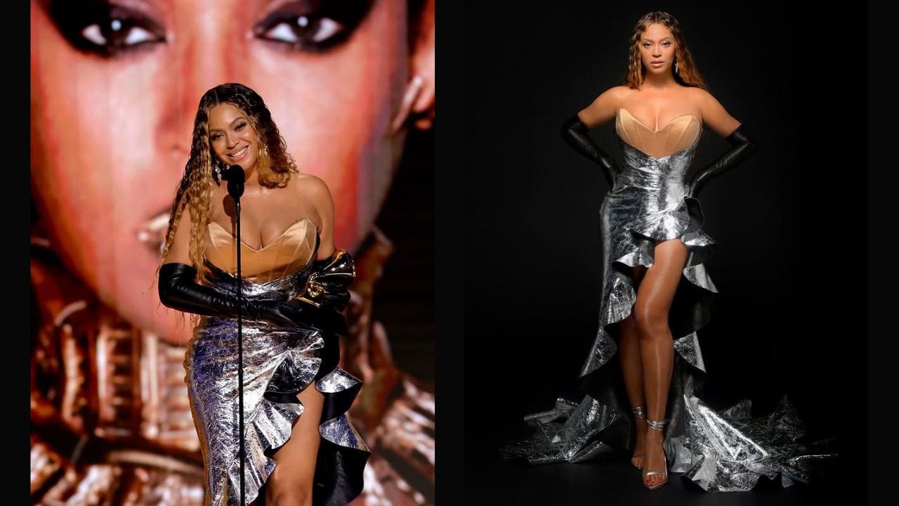 Beyoncé’s silver Gucci gown featured a corseted bodice and tiered crushed-metal skirt. The high slit and ruffled detailing echoed her Renaissance era, paired with luminous makeup and minimal accessories for maximum impact.