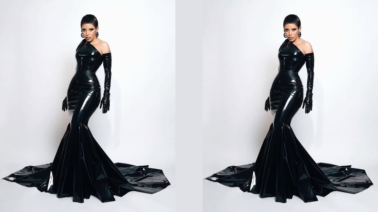 Doja Cat chose a second-skin Atelier Versace gown with a dramatic open back and twisted shoulder detail. The latex-like finish hugged her silhouette, while sleek hair and sharp makeup elevated the futuristic feel.