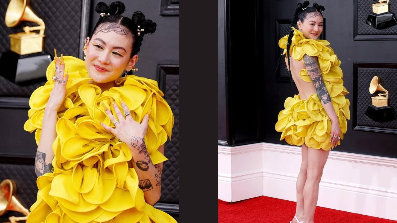 Michelle Zauner wore a sunny yellow Valentino Haute Couture mini-dress with ruffles and an open back. Pearl hair accents, matching manicures, and fresh makeup reflected the joyful tone of her Jubilee era.