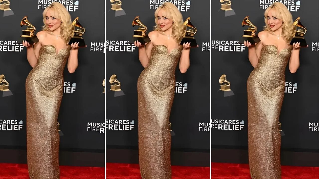 Sabrina Carpenter embraced classic glamour in an off-shoulder gold Versace gown that shimmered under the lights. The structured bodice highlighted her frame while the metallic fabric added softness and movement. Minimal jewellery allowed the dress to dominate, with glowing skin and polished makeup completing the look.