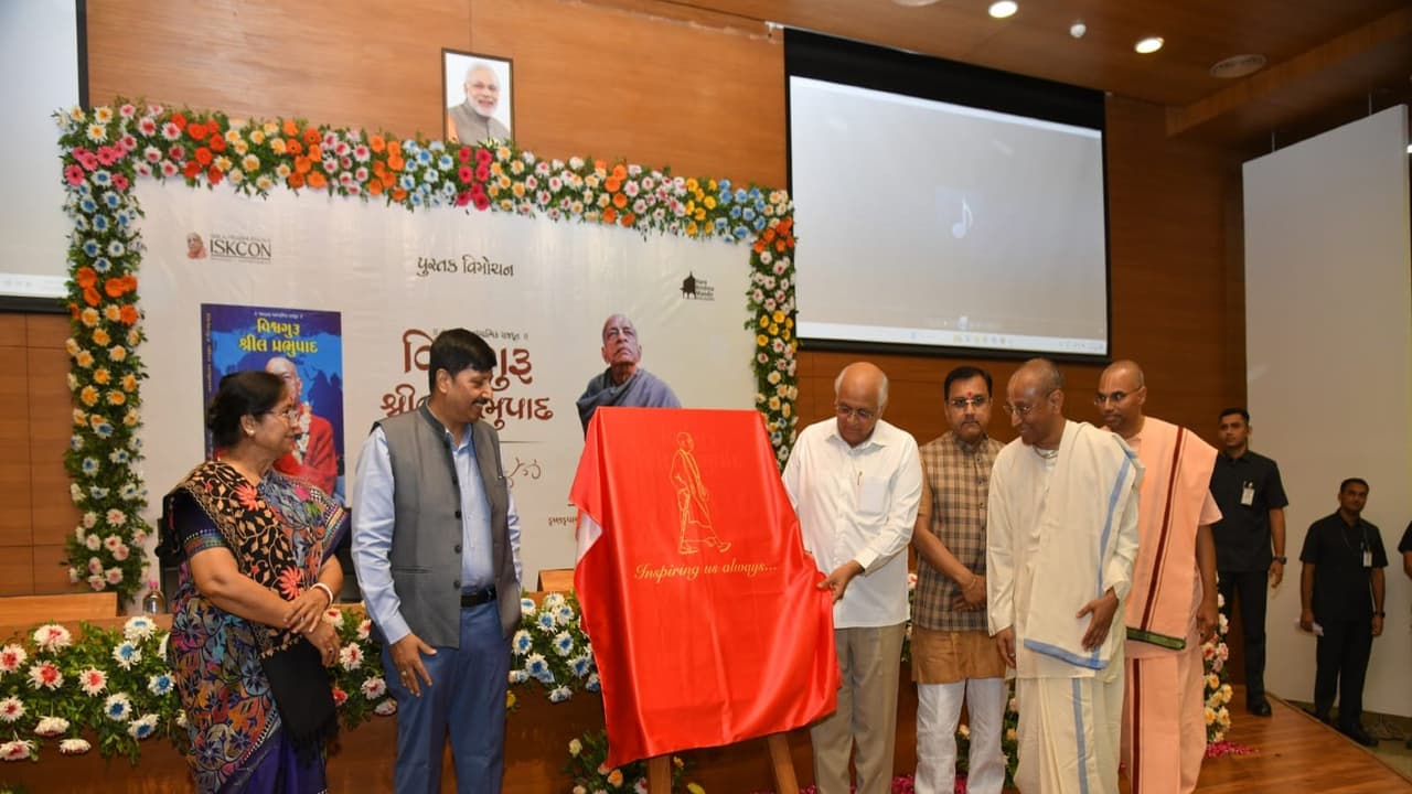Gujarat Chief Minister Bhupendra Patel released the Gujarati biography “Vishwaguru Srila Prabhupada” in Gandhinagar, which is based on the inspiring life of the Founder-Acharya of ISKCON, Acharya Srila Prabhupada, who carried Indian spirituality and Vedic wisdom to the global stage.