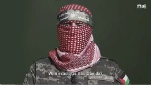 Abu Obeidah also known as Huthayfa Samir Abdallah al-Kahlout, served as the group’s spokesperson since 2007 and was one of Hamas’s best known representatives in the Arab world. He frequently appeared in videos disseminated by the group, masked in a red- checkered Palestinian Keffiyeh.
