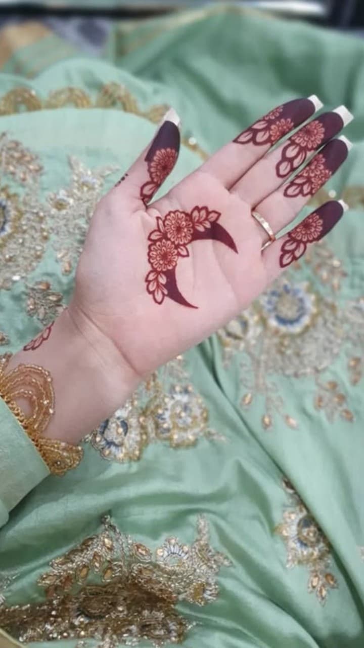 Anyone can make such sober mehndi designs on Arabic art and half moon. Here is a combination of moon-flower and pendant chandelier, which is perfect for Diwali and festive look.