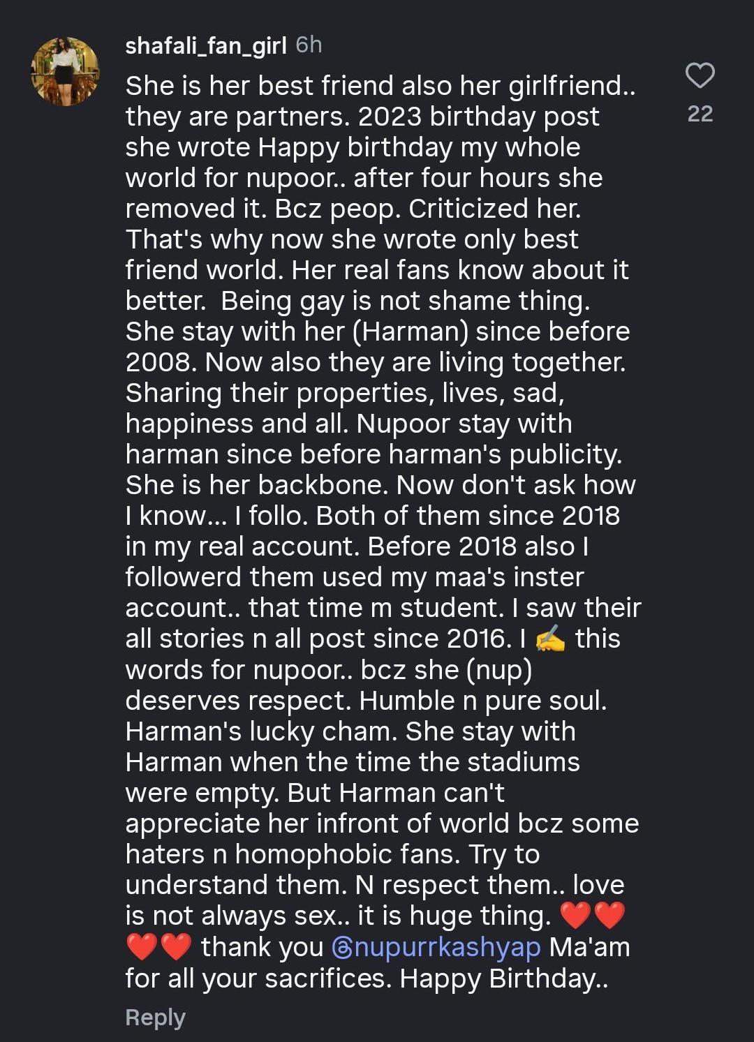 “She is her best friend, also her girlfriend. They are partners. 2023 birthday post, she wrote Happy Birthday, my whole world for Nupoor. After four hours, she removed it. Because people criticized her. That’s why now she wrote only the best friend world. Her real fans know about it better. Being gay is not a shameful thing. She has stayed with her (Harman) since before 2008. Now, they are living together,” an Instagram user wrote.