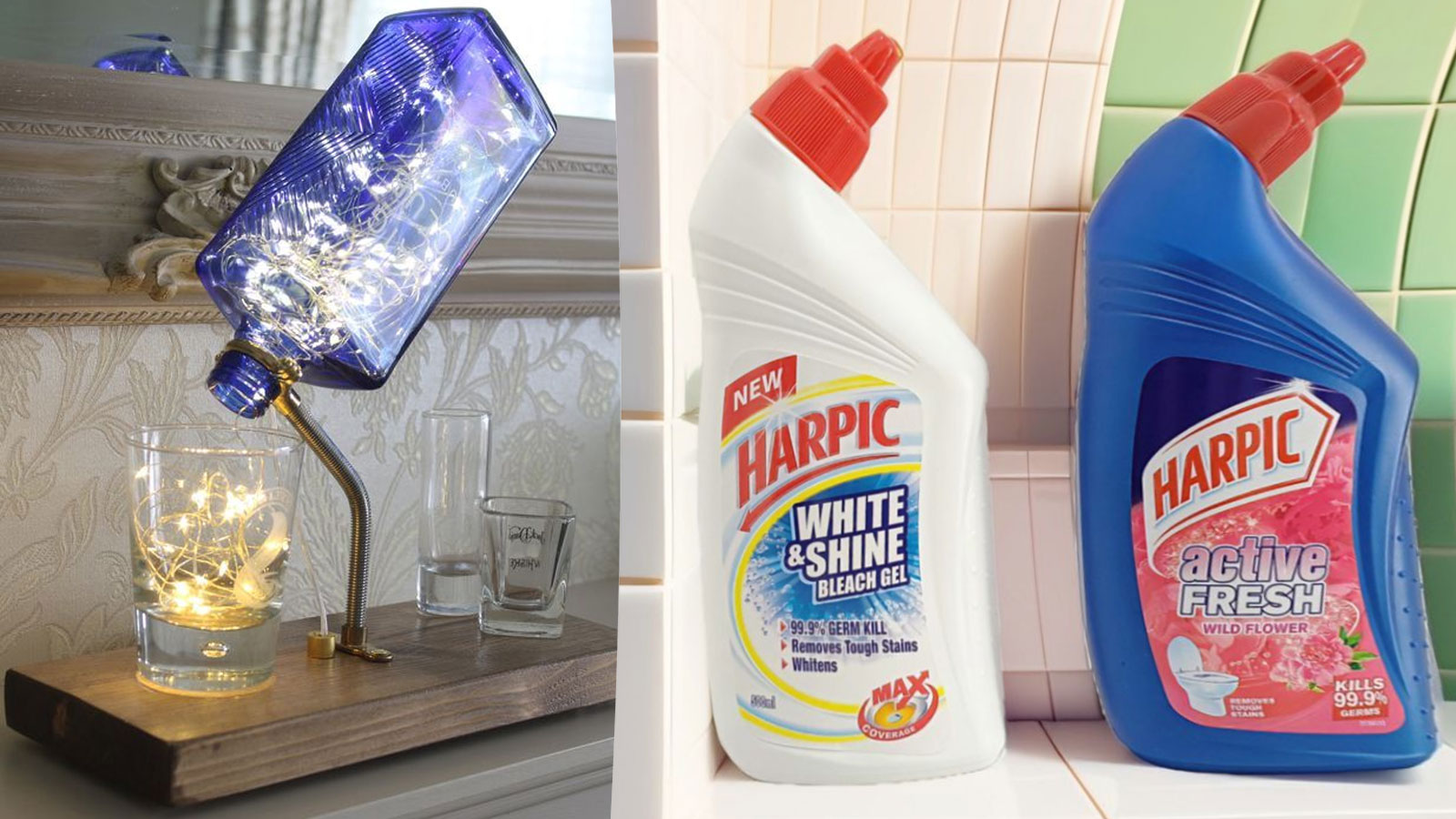 To give a unique look to old Harpic bottles, you can decorate your house by making a DIY lamp. Cut design on bottle, insert LED light inside. Paint the outside or apply glitter, this gives a night lamp like effect.