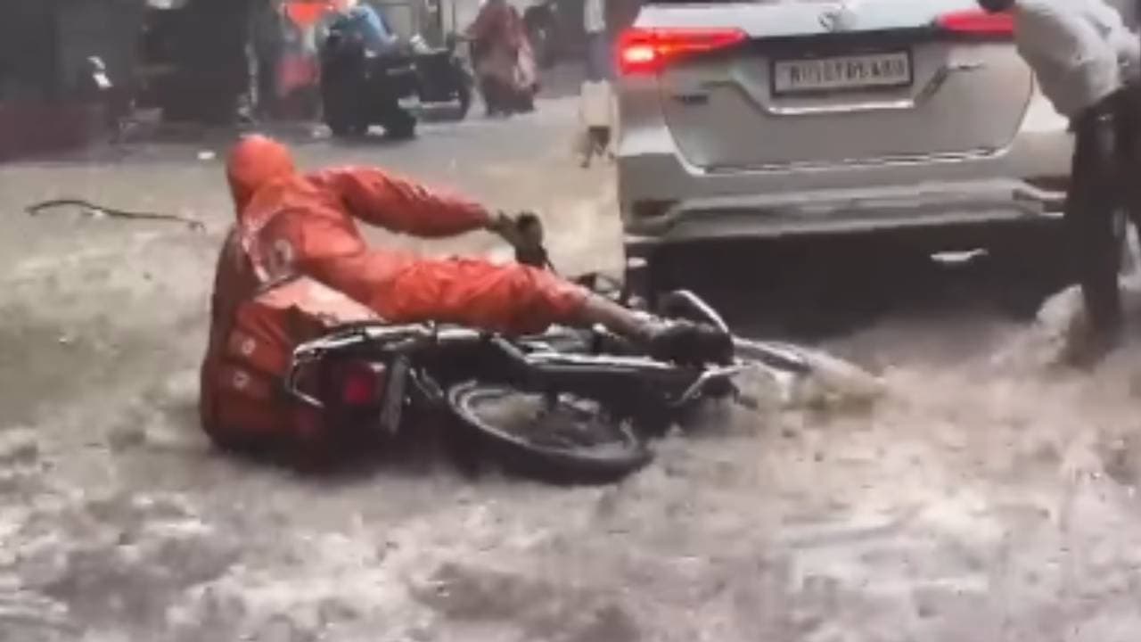 In Pune, a delivery boy was riding a bike on a road filled with knee-deep water. His bike suddenly stopped due to heavy rain. When he was trying to start the car, he lost his balance and fell into the water. Due to the fall, the delivery box behind the bike opened and all the parcels started flowing into the water. But the good thing is that three people who saw the accident immediately ran to help him. He not only picked up the boy but also helped him collect his belongings that were floating in the water. The video of this incident is now spreading rapidly on social media.