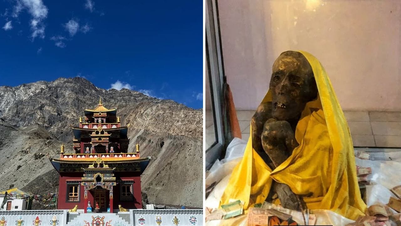 Gue, also called Giu, sits close to the Indo-China border in Lahaul and Spiti, wrapped in silence and stark beauty. The village houses the naturally preserved mummy of Buddhist monk Sangha Tenzin, seated in a meditative lotus posture. Discovered after an earthquake in 1975, the body survived without chemicals, aided by extreme cold and dry air. The monk now rests inside a glass chamber within a small monastery, drawing pilgrims and curious travellers alike.