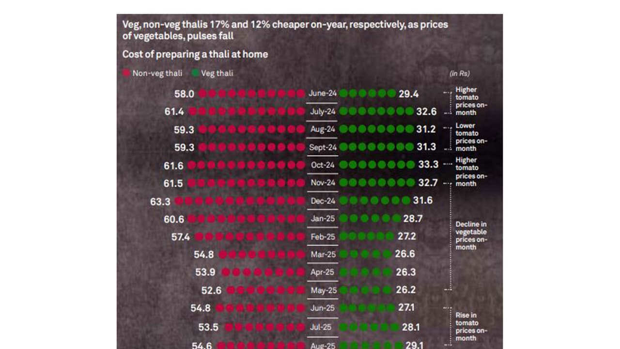 Onion and tomato prices slipped 3 per cent and 8 per cent month-on-month, respectively, helping lower the overall cost of thalis, while prices of other inputs remained largely stable. The decline in the non-veg thali cost was on account of an estimated 4 per cent month-on-month drop in broiler prices amid oversupply.