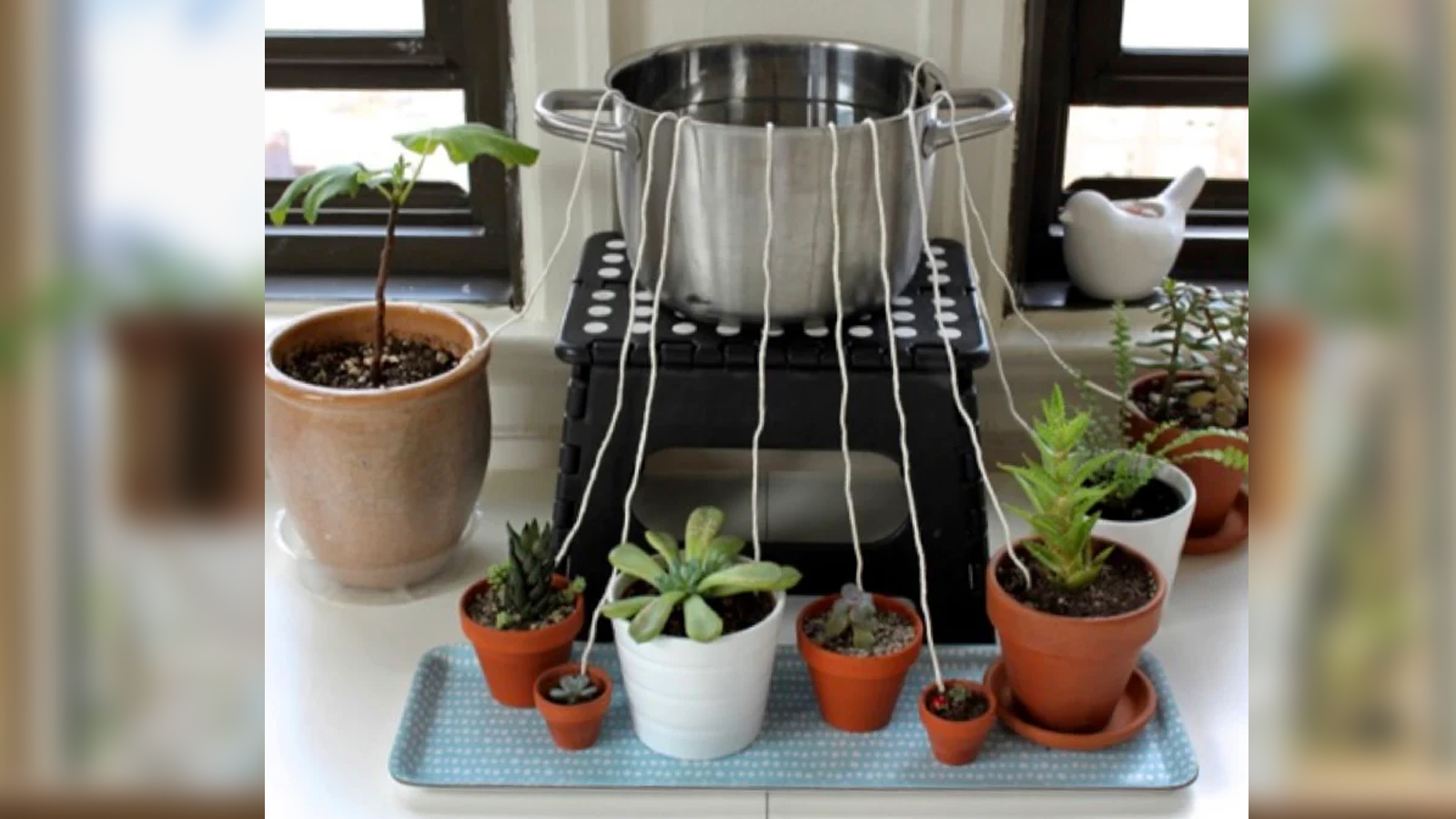 This method is the easiest and most reliable. Fill a large vessel/bucket with water. Take a thick cotton thread or cotton shoe lace. Bury one end in water and the other in the soil of the plant by 2–3 inches. Water will slowly shift into the soil and the plant will be protected from drying out. Money plant, snake plant, spider plant are best for all indoor plants.