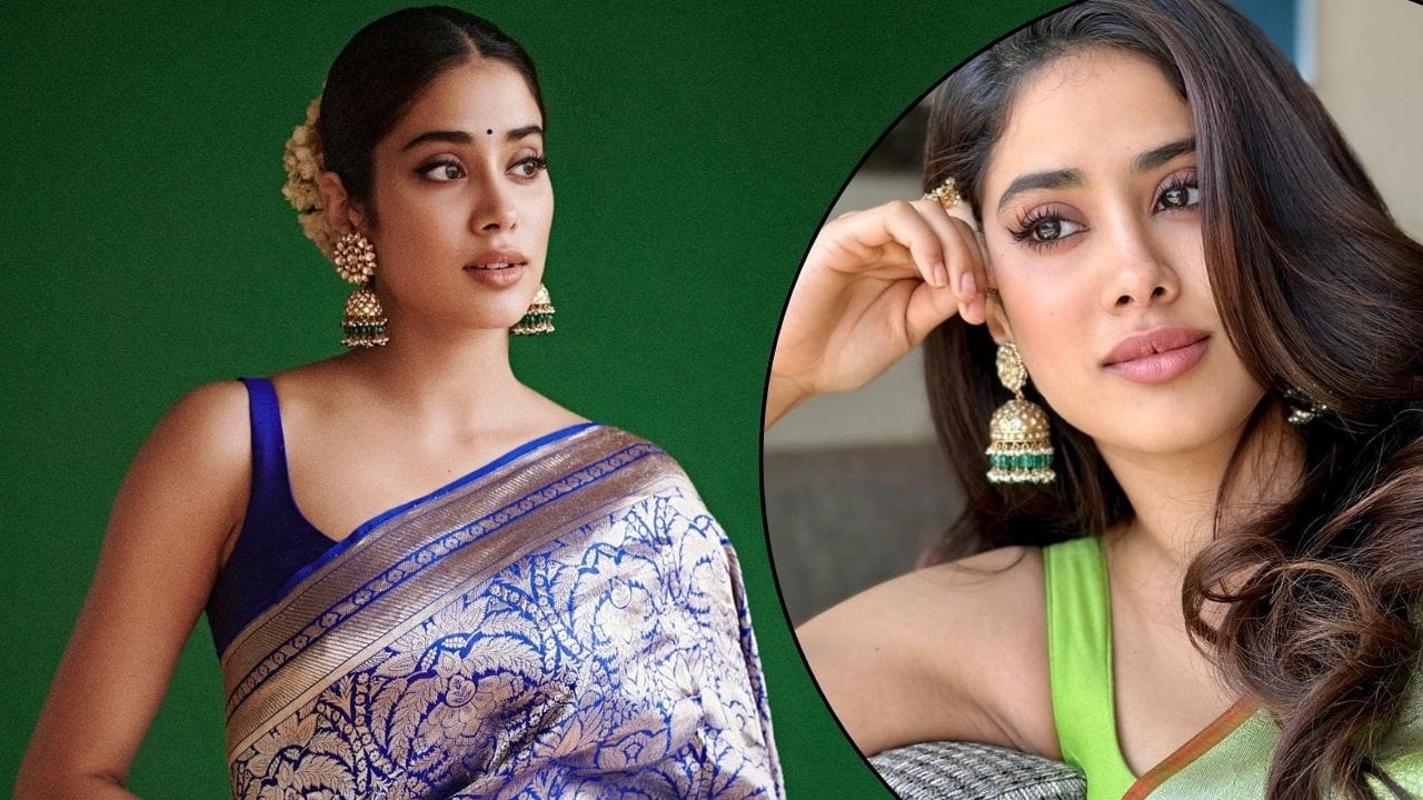 If you have carried any lehenga or saree which is embellished i.e. which has beads, golden threads, pearl work, then like Janhvi Kapoor, you should carry polki jhumkas which have drop pearls. Along with this, you can also choose a design of Polki earrings which has beads matching your outfit, like Janhvi’s earrings have emerald green beads.