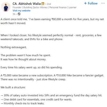 “Every time his salary went up, so did his spending. A Rs 5,000 raise became a new subscription. A Rs 10,000 hike became a fancier gadget. There was no intentionality-just slow lifestyle creep,” said Walia.