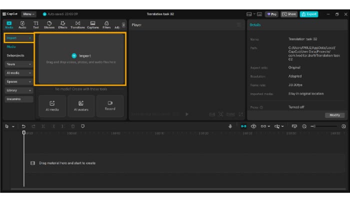 Start CapCut PC and click on the “Import” button at the top. Locate the saved TikTok ad on your device and choose it. Ensure that the video is in a supported format, like MP4, so there will be no problems.