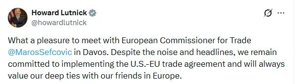 In a post on X, Lutnick reiterated that Washington intends to carry forward work on a comprehensive trade agreement with the European Union that could deepen economic ties and streamline cross-border commerce.