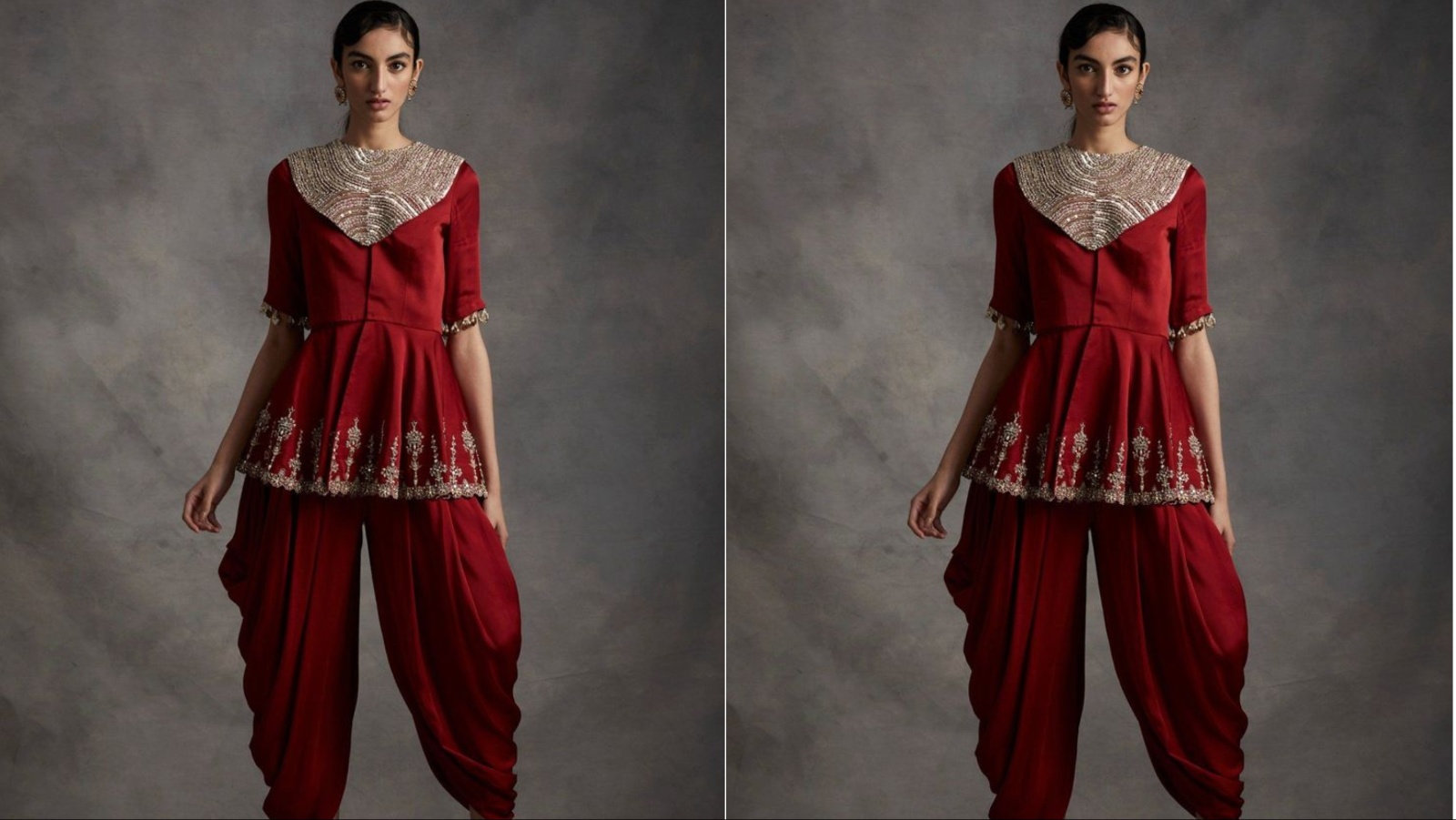 This type of peplum dhoti kurta set can be selected by applying a modern look in a traditional look on Karva Chauth. Such dhoti salwar suit in red or maroon color is perfect for matte finish. Here the kurta is placed in a paplam style instead of frock, which is creating a waste fitted look. Sequen work has been done keeping the neckline v shape, which is giving a necklace Illusion. At the same time, there is a golden-silver embroidery on the hemline of the kurta. You can choose it on one third or half sleeve.