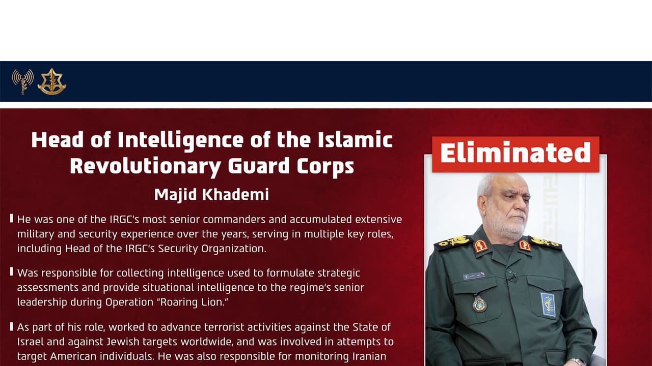 The Israeli Air Force (IAF) said on Monday that it eliminated the IRGC’s intelligence head in overnight strikes in Iran. Sharing the details in a post on X, it said, “Guided by precise intelligence from Military Intelligence, the Air Force struck overnight in Tehran and eliminated Majid Khotam-Khasini Khademi – Head of the Intelligence Organisation of the Revolutionary Guards.”