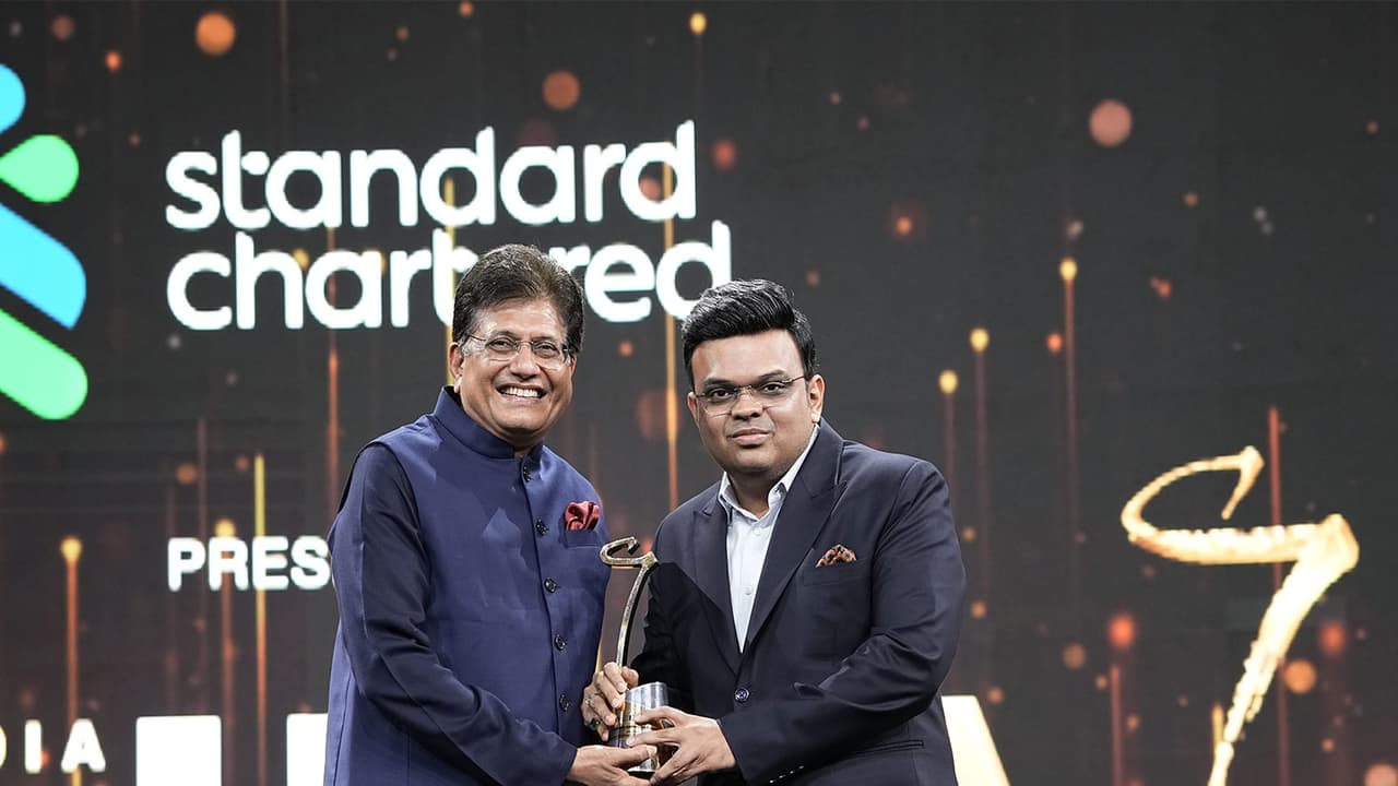 International Cricket Council (ICC) Chairman Jay Shah receives the ‘Outstanding Contribution in Sports Award’ from Union Minister Piyush Goyal at the Indian Business Leader Awards in Mumbai on Saturday.