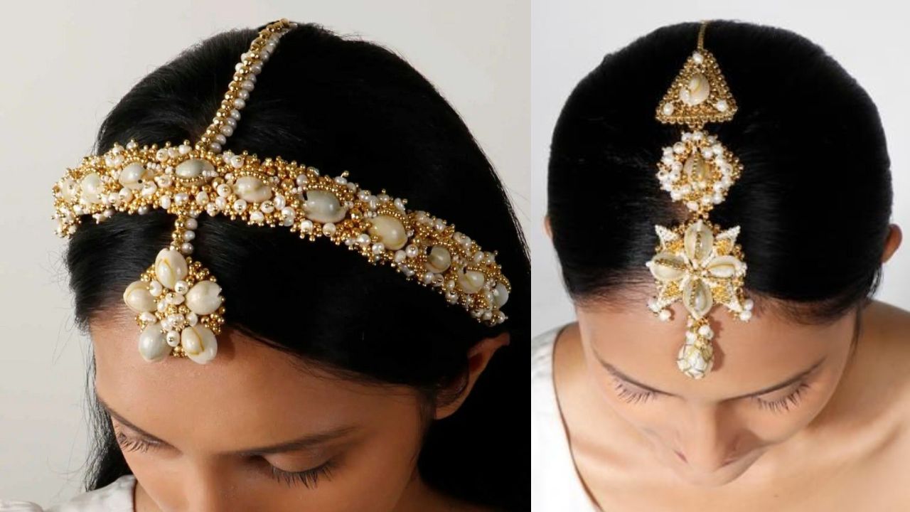 If you are wearing all the conch shell jewellery, then it looks good if the maang tikka or sheesh phool is also matching. Here for you we have brought the designs of both Maang Tikka and Sheesh Phool, you can wear whichever design you like for your outfit.