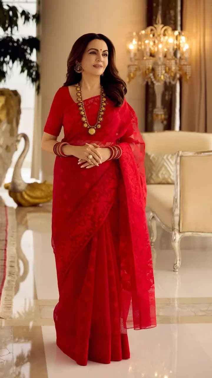 If you have to attend any event, then this type of saree is the best option. You can spread your beauty by wearing a pearl set with this cream colored saree adorned with thread work.