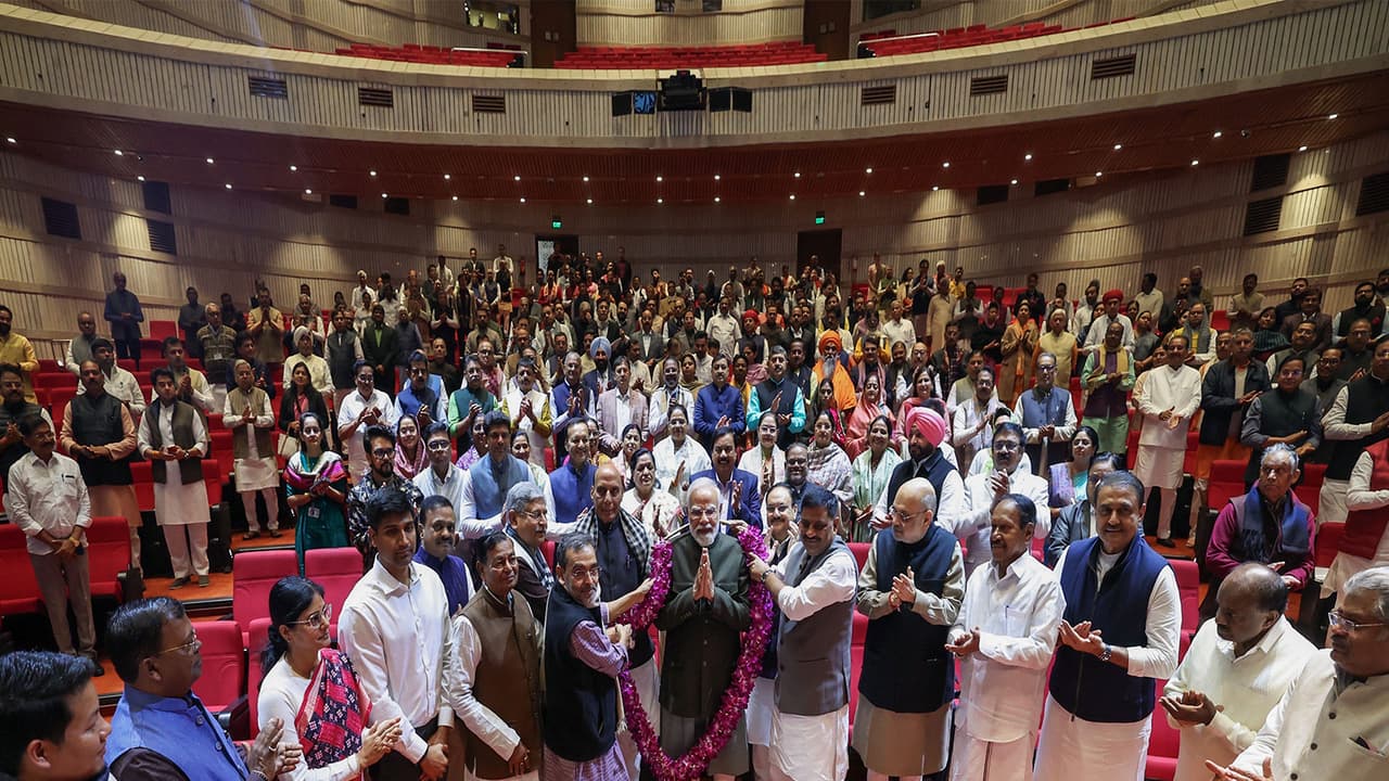 The NDA leaders felicitated PM Modi at the Parliamentary Party meeting at the GMC Balayogi Auditorium in the Parliament Library Building (PLB).
