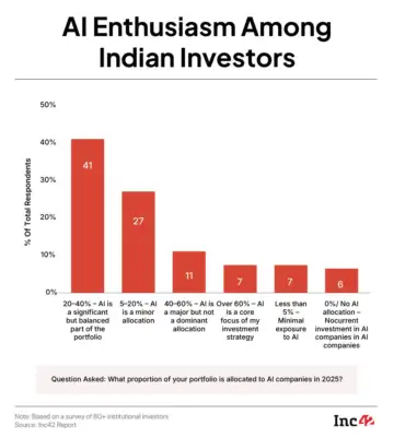 A recent survey of more than 80 institutional investors conducted by Inc42 revealed that while 41% of Indian investors are allocating 20-40% of their portfolios to AI, only 7% are making it a core investment focus. Coincidentally, the share of investors with the least exposure to AI investments is also 7%.