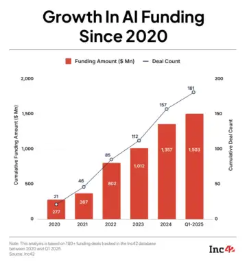 US-based Anthropic raised $13 Bn in its Series F round last month, OpenAI secured $40 Bn in March, and several smaller US AI startups raised between $100-200 Mn each. In comparison, the largest AI round raised in India this year was $25 Mn, raised by Chennai-based SuperOps.