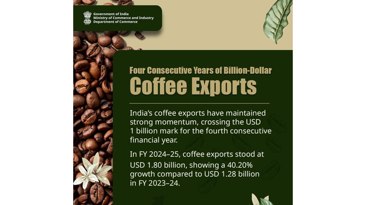 India’s coffee exports have continued their strong upward trajectory, maintaining their billion-dollar streak for the fourth consecutive financial year, according to the Department of Commerce under the Ministry of Commerce and Industry. During the financial year 2024-25, India’s coffee exports reached USD 1.80 billion, marking a 40.2 per cent growth over the USD 1.28 billion achieved in FY 2023-24, the department said in a X post, attached with it an infographic.