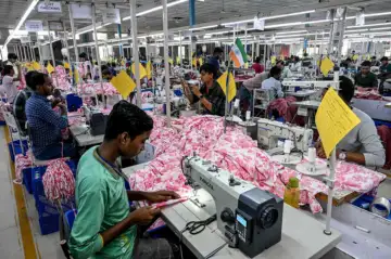 Employees stitch clothing material for dresses at the apparel manufacturing unit at Bhiwandi in the Thane district of India