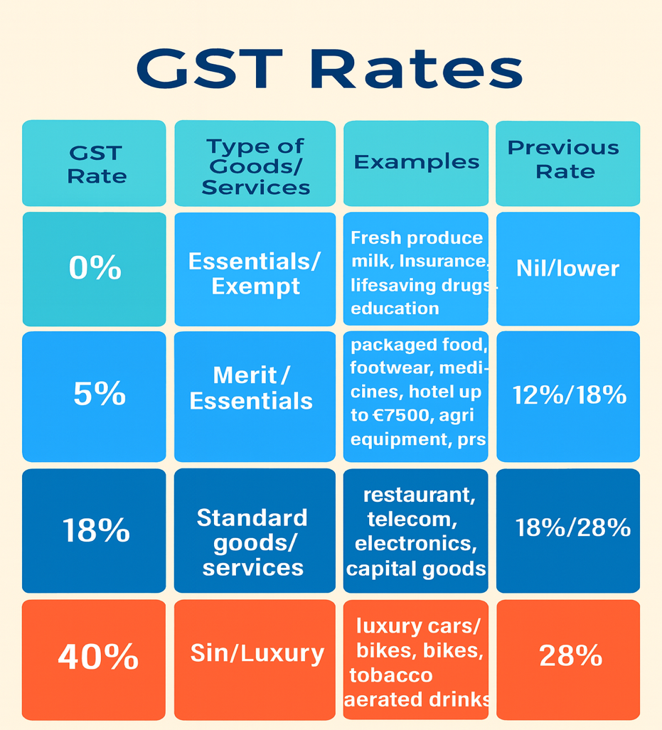GST 2.0 consolidates the previous five slab system (0%, 3%, 5%, 12%, 18%, 28%) into three major tiers: 0%, 5%, 18%, with a 40% bracket for luxury and demerit goods. Nearly all daily-use, agricultural, and essential products now attract 0% or 5% GST, while close to 90% of goods from the high 28% rate are downshifted to 18%.