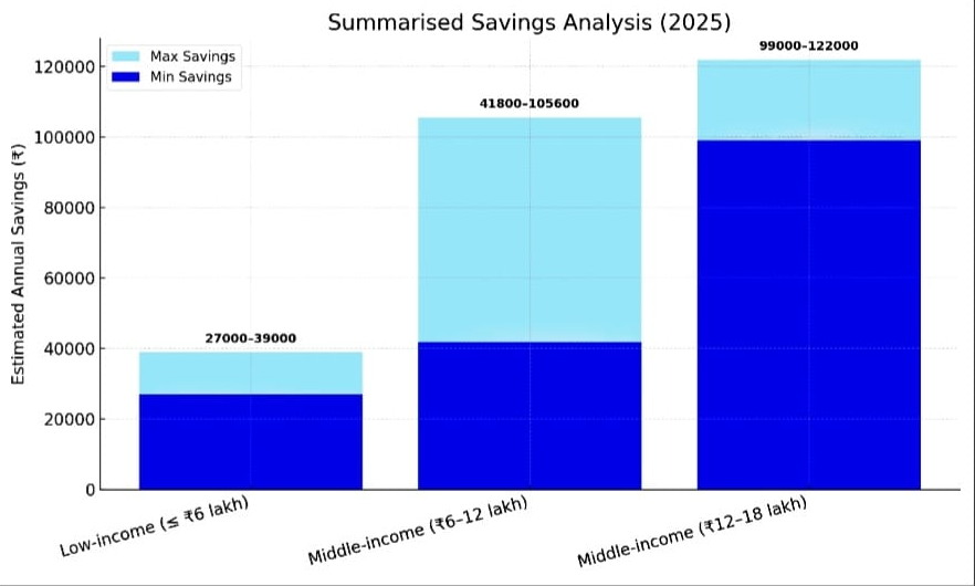 The 2025 income tax and GST reforms are set to significantly ease financial pressures for economically weaker sections, low and middle-income households. Families earning up to ₹6 lakh annually will see complete income tax exemption, saving about ₹23,000–₹31,000, along with ₹4,000–₹8,000 in GST relief, totaling up to ₹39,000 a year. Middle-income households, particularly those between ₹6–18 lakh, stand to benefit even more, with income tax savings ranging from ₹33,800 to over ₹1 lakh and GST savings of ₹8,000–₹20,000. In total, these reforms could put an additional ₹41,800 to ₹1.22 lakh in the hands of middle-class families annually, boosting disposable income and consumption.