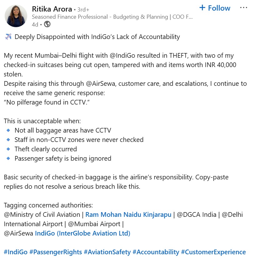 The passenger, Ritika Arora, shared her experience in a detailed LinkedIn post that has since gone viral. She wrote that during her recent Mumbai–Delhi IndiGo flight, both of her checked-in suitcases were “cut open, tampered with” and valuable items were missing.