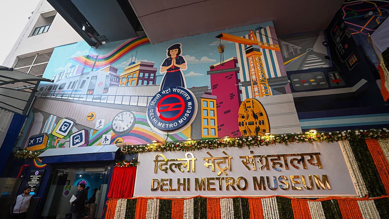 The entrance of the Delhi Metro Museum features colourful murals depicting trains, construction equipment and city life. Located at Supreme Court Metro Station, the museum has been redesigned with a modern, immersive layout. Floral decorations mark its official opening to the public.
