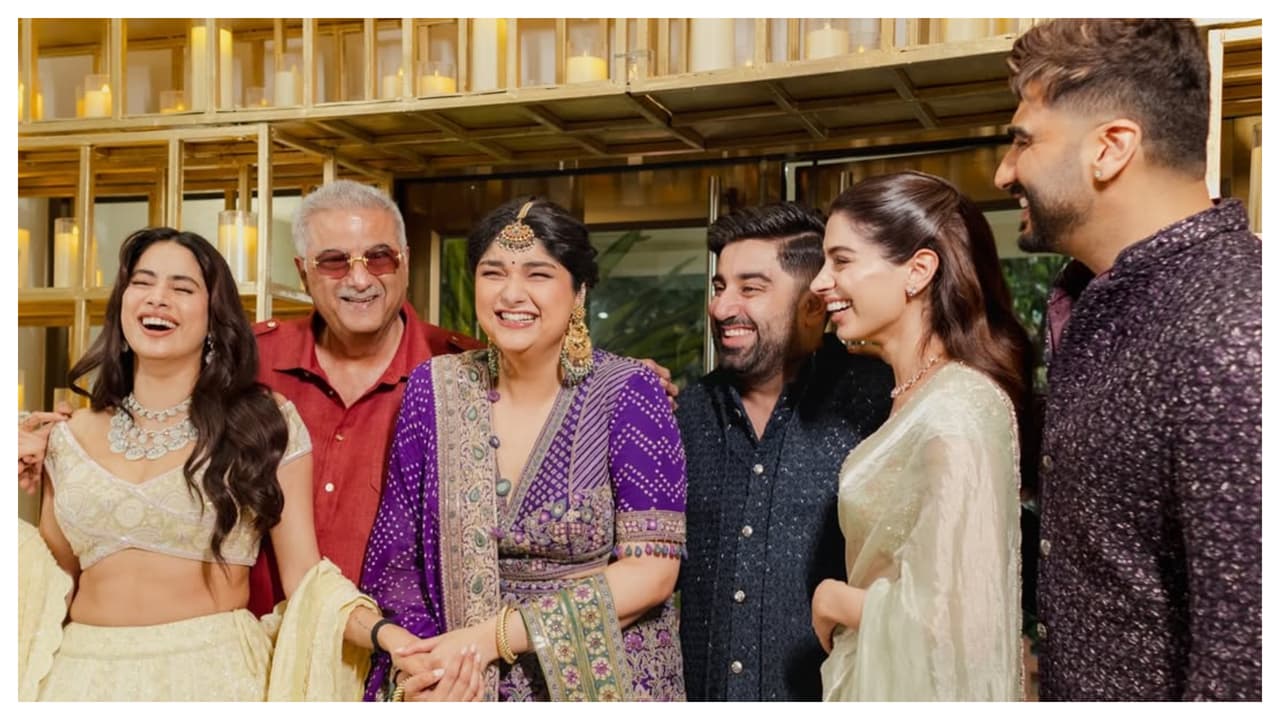 <p>Anshula Kapoor has finally posted stunning photos from her engagement to Rohan Thakkar. Janhvi Kapoor, Sonam Kapoor, Arjun Kapoor, and others were spotted enjoying her special day.</p><img><p>Anshula Kapoor, Arjun Kapoor’s sister, got engaged to her boyfriend Rohan Thakkar on October 2. Her father, Boney Kapoor, hosted a modest engagement ceremony at his Bandra home, and the whole Kapoor clan was spotted there. Two days later, Anshula finally revealed official images from the ‘Gor Dhana’, or engagement ceremony.&nbsp;</p><img><p>She uploaded gorgeous images with her brother Arjun Kapoor, sisters Janhvi and Khushi Kapoor, and their father, Boney Kapoor. Sonam Kapoor, Shikhar Pahariya, Shanaya Kapoor, and Rhea Kapoor were also included in the stunning images.</p><img><p>Anshula’s homage to her late mother, Mona Shourie, was a particularly moving moment throughout the celebration. She honoured her mother by reserving a seat next to her and placing a framed portrait of her there.&nbsp;</p><img><p>Anshula wrote in her caption that she felt her late mother’s presence on that memorable day. Anshula also had an emotional moment with her brother and actor Arjun Kapoor, as shown in one of the photos she shared on social media.&nbsp;</p><img><p>Meanwhile, in one ecstatic shot, Boney Kapoor blesses the newly engaged pair, Anshula and Rohan.</p><img><p>A lovely group shot showed the complete Kapoor family together. Sonam stood with Anshula and Rohan, while Arjun and Karan Boolani posed in the front. Shikhar Pahariya was spotted close to Janhvi, while Shanaya, Jahaan, and Rhea Kapoor were also present in the happy shot.&nbsp;</p><img><p>Another candid snapshot shows Anshula dancing with her father, Boney Kapoor, while another shows her posing with her sisters Janhvi and Khushi.</p><img><p>In her caption, Anshula wrote, “02/10/2025 This wasn’t just our Gor Dhana, it was love showing up in every little detail. Ro’s favorite words have always been “Always and Forever" – and today, they started to feel real in the sweetest way. His love makes me believe fairytales don’t just live in books, they live in moments like these."</p><img><p>She further added, “A room overflowing with laughter, hugs, blessings, and the people who make our world feel full. And then, Ma’s love…quietly wrapping itself around us. In her flowers, in her words, in her seat, in the way her presence could still be felt everywhere. All I remember is looking around and thinking: this is what forever should feel like. Rab raakha."</p><img><p>In an Instagram video, Arjun Kapoor is seen chatting with the paparazzi while doing his big brother responsibilities at his sister Anushula’s special occasion.&nbsp;</p><img><p>He meekly stood before the camera and asked the photographers to maintain proper decorum so that the building’s occupants would not bedisturbed.</p><img><p>Anshula and Rohan met on a dating app in 2022. In July of this year, Rohan proposed to Anshula in Central Park, New York.</p>