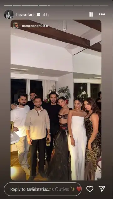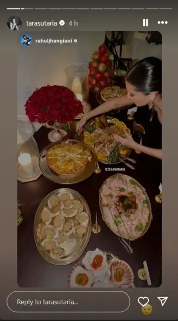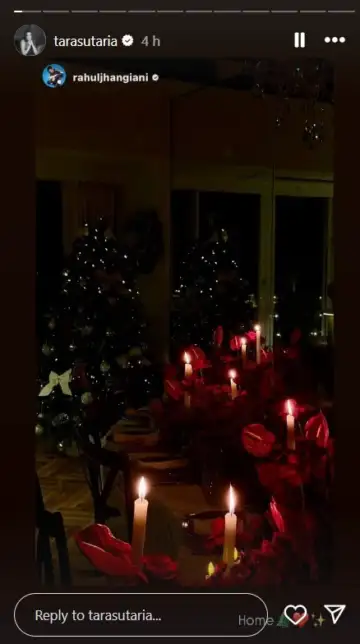 The Student of the Year 2 actress further shared a series of inside glimpses on her Instagram stories. In one of them, we can get a sneak peek at the lavish dinner setup, featuring a dining table adorned with red floral arrangements and candles, creating a warm and welcoming atmosphere. Two large, decorated Christmas trees adorned with lights and ornaments are also visible in the background. Tara captioned it “Home,” followed by a couple of emojis evoking festive cheer.