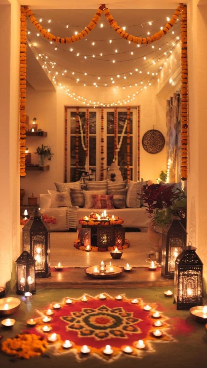Keep one big urli and two-three small urli of different sizes on the center table or on the side. Fill the urli with water and place flowers and petals, also light a candle, this will give an aesthetic and festive look.