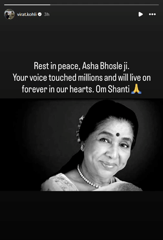 “Rest in peace Asha Bhosle ji. You voice touched millions and will live on forever in our hearts. Om Shanti,” Kohli wrote on his Instagram story.