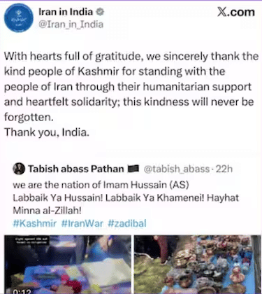 Srinagar: The Embassy of Iran in India has deleted several posts on X that thanked India and the “kind people of Kashmir” for humanitarian aid, following criticism from Pakistan-based users over references to Kashmir as part of India.