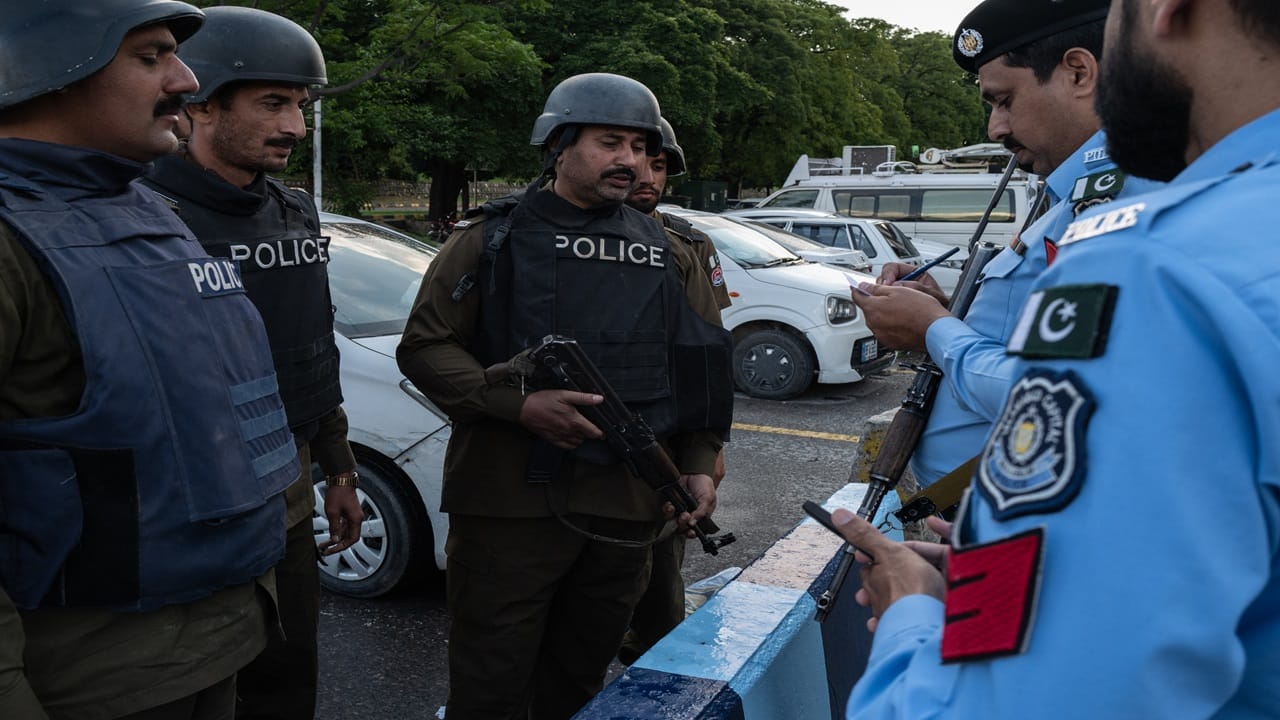 Pakistani security personnel are briefed at a checkpoint ahead of a meeting between US and Iranian officials on April 9, 2026 in Islamabad, Pakistan. (Photo by Rebecca Conway/Getty Images)