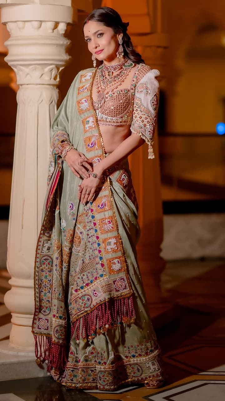 At 40+, very dark or very bright colors appear harsh. Ankita Lokhande often wears pastel shades like peach, powder pink, mint green. Silk blouse always has an age-defying effect.