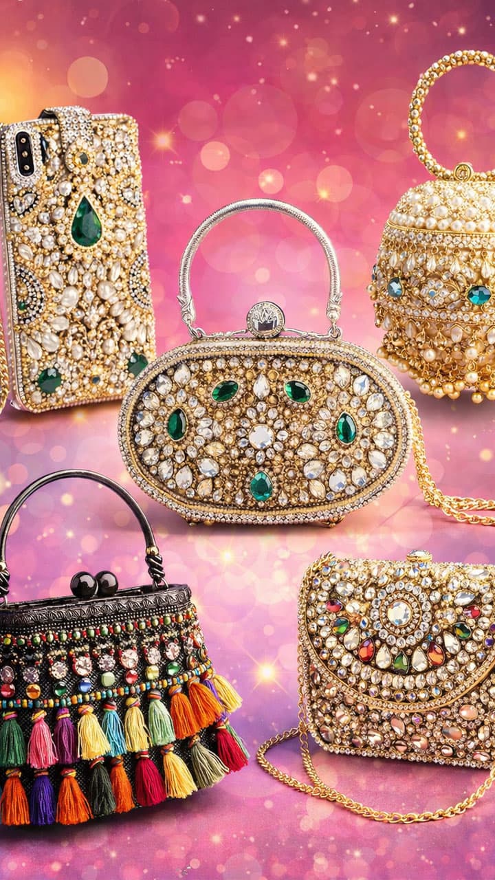 Jewelery bags usually have work of stones, pearls, beads, sequences, metal which gives it a rich and classy look. This is especially perfect for the festive season or wedding party.