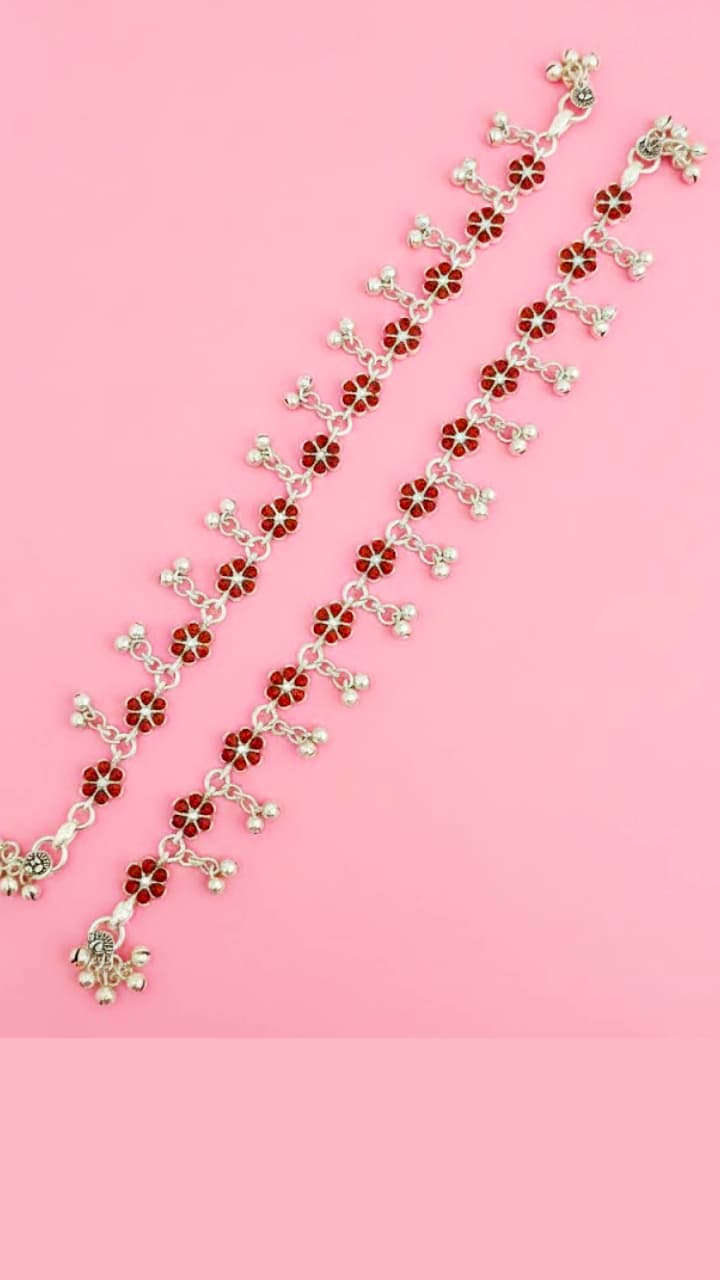 Snack chain silver anklets are comfortable and yet look flashy. The wide silver chain has chic round circle work with red and green color stones, which is best for daily wear.