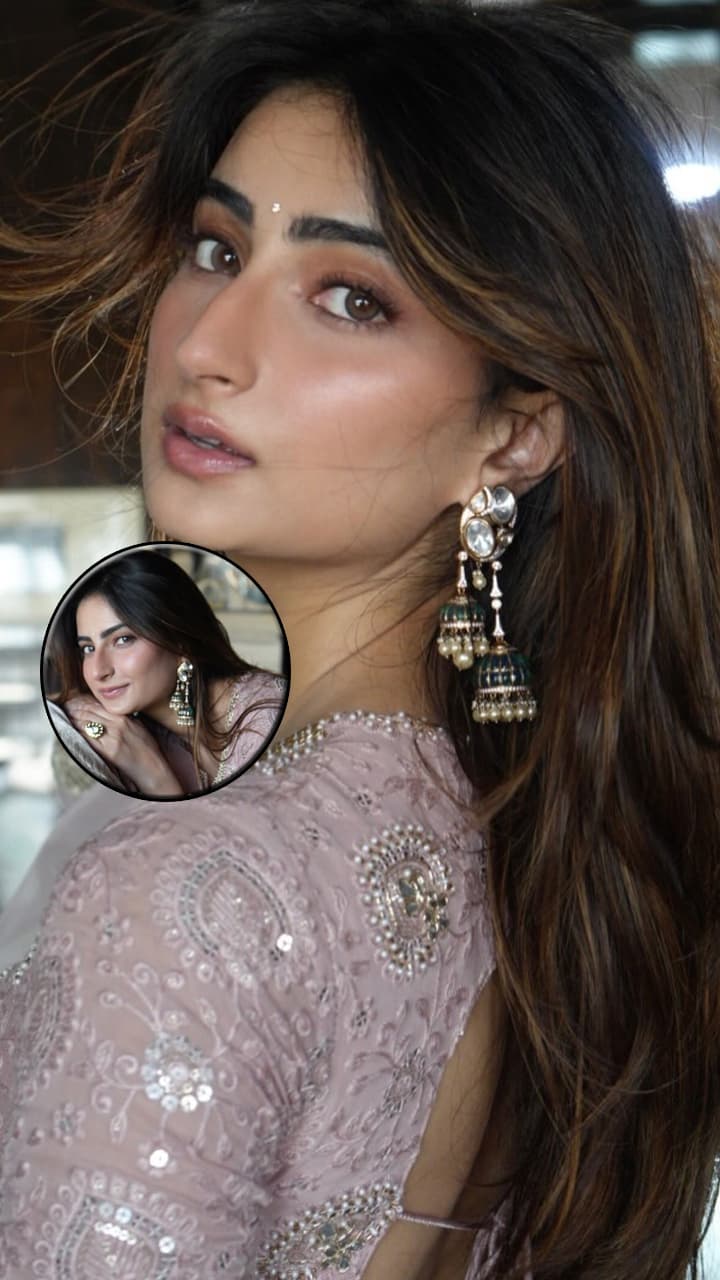 You can wear hanging jhumkas decorated with white, pink and green stones in a wedding or festival. 3 Jhumkas are hung at the bottom with peacock studs which have pearl beads attached to them.