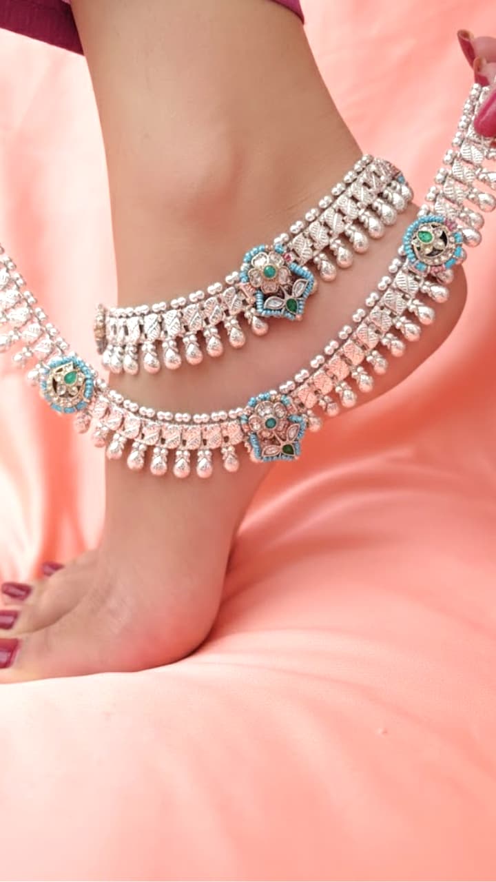 Jodhpuri style German silver anklet with fringe work. It has layers of semi circular chain, at the end there are colorful beads, which are making the feet beautiful. You will get up to Rs 300 on artificial.