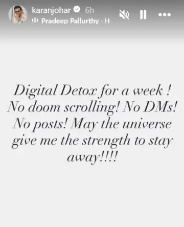 Early on Tuesday morning, Karan took to Instagram Stories to share a brief note. “Digital detox for a week. No doom scrolling! No DMs! No posts! May the universe give me the strength to stay away,” it read.