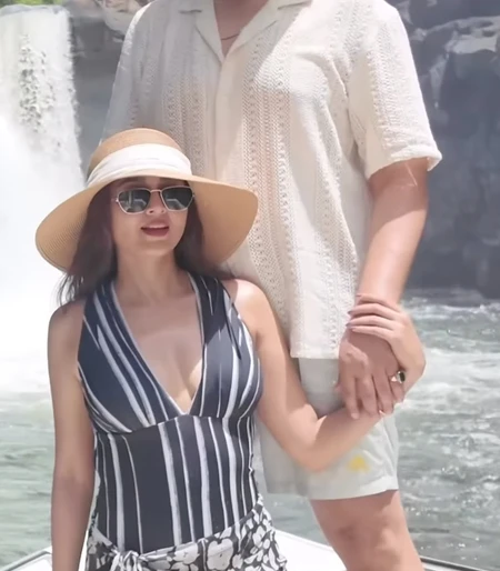 Both of them are seen dressed in chic holiday outfits with hats and sunglasses. The video then heads on to show the two enjoying water sports, including parasailing high above the sea with a rainbow-hued parachute, and riding an inflatable tube across the water body.