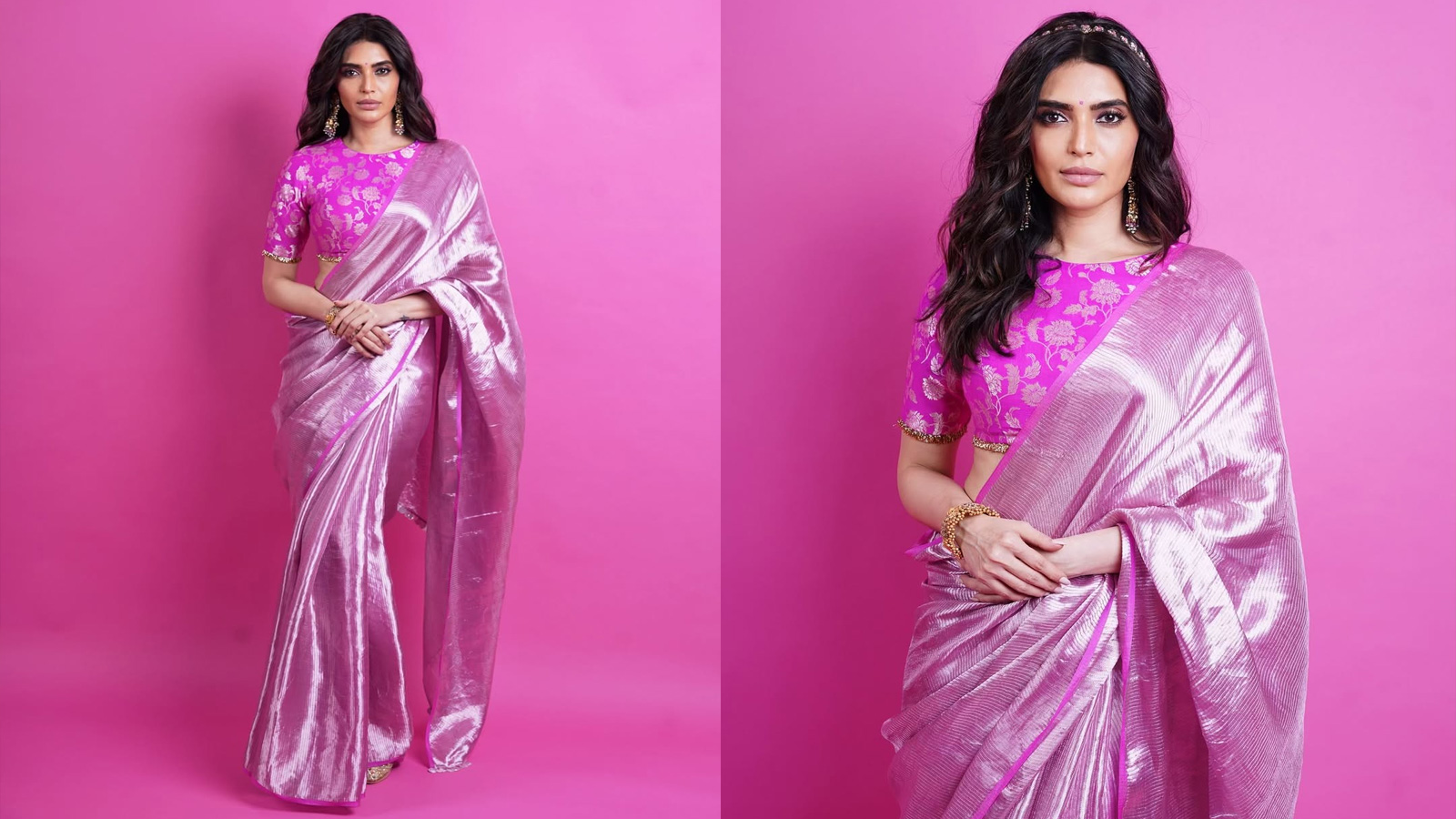 Pink tissue silk saree is the best option if you want a light and casual elegance. Karishma Tanna Plain is wearing a Banarasi shades blouse with a sari. You may look young and fresh in this type of saree. On Karva Chauth, you can try a hair band with heavy earrings with such a saree blouse.