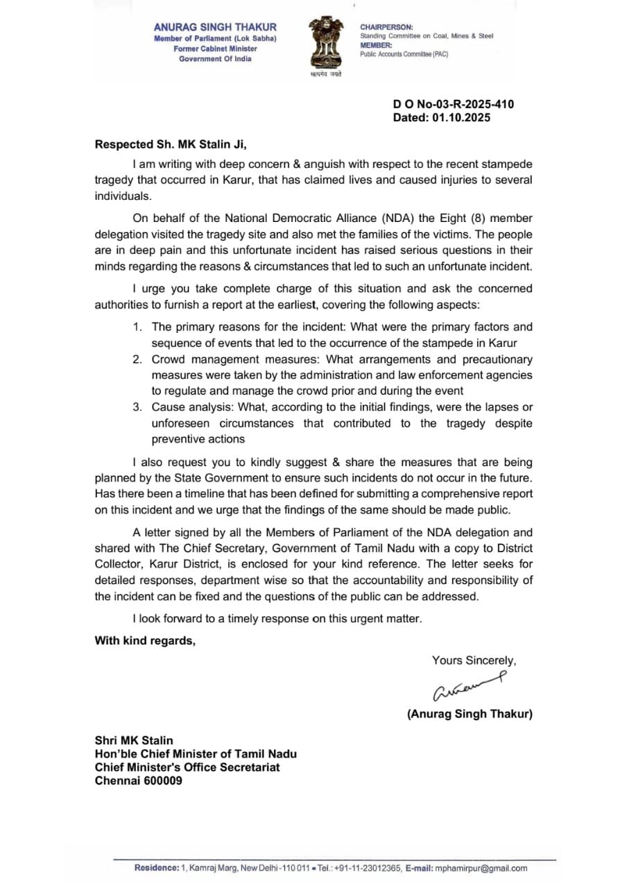 Chennai: BJP MP Anurag Thakur, who was part of the BJP-NDA delegation that visited Karur where stampede took place during TK chief Vijay’s rally killing over 40, has written to Tamil Nadu Chief Minister MK Stalin to take charge of the situation and complete a probe into the incident at the earliest.